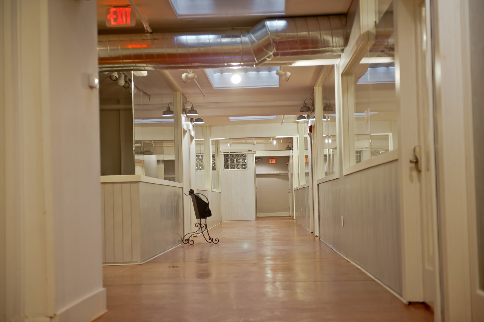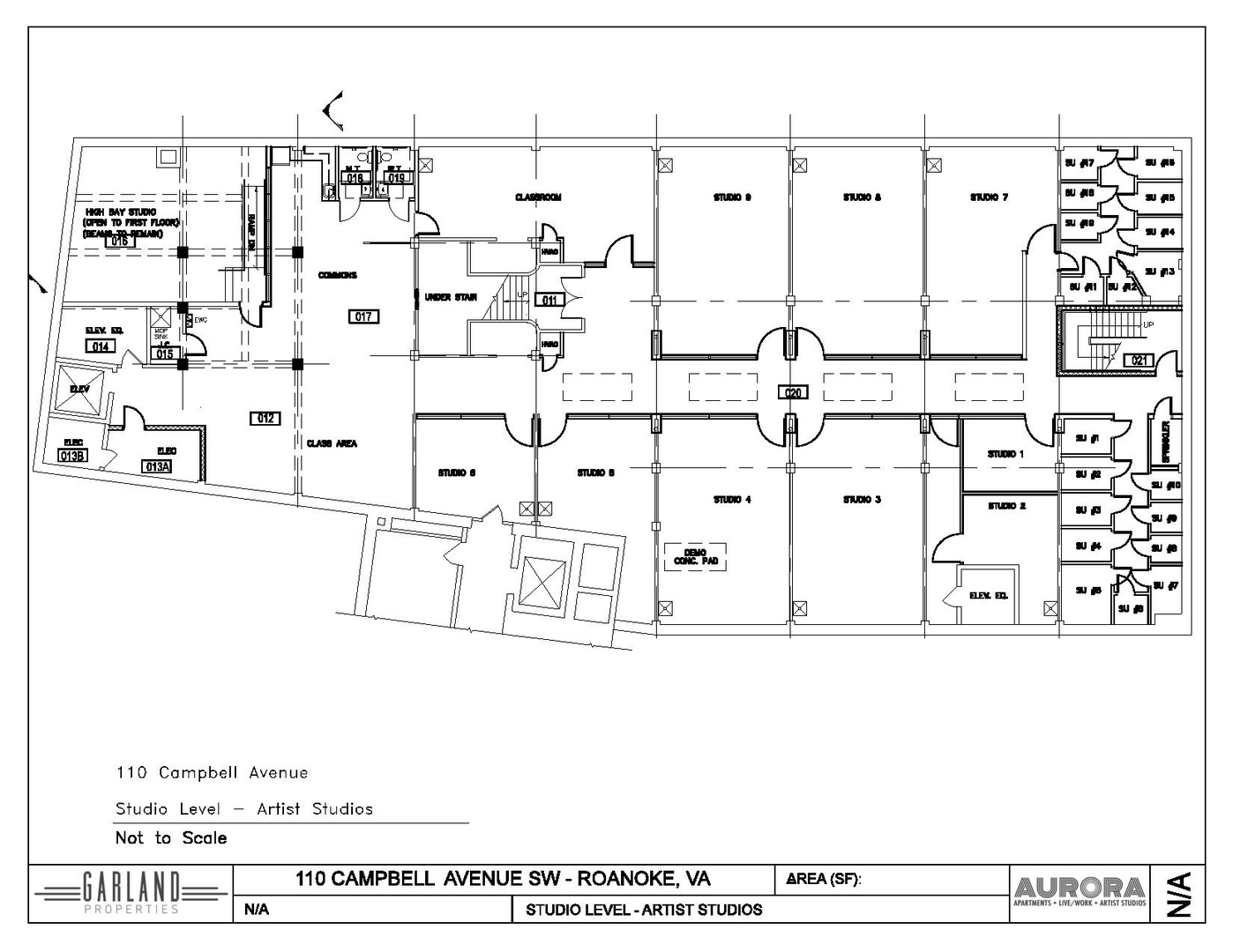 Studio #2 occupies the space shown on the layout for Suites 1 & 2, but there is no current plan to subdivide. The total foot print is approximately 20 x 30 w/ a 9x9 elevator equipment room occupying the rear of the space, a total of 519 square feet of occupiable area.